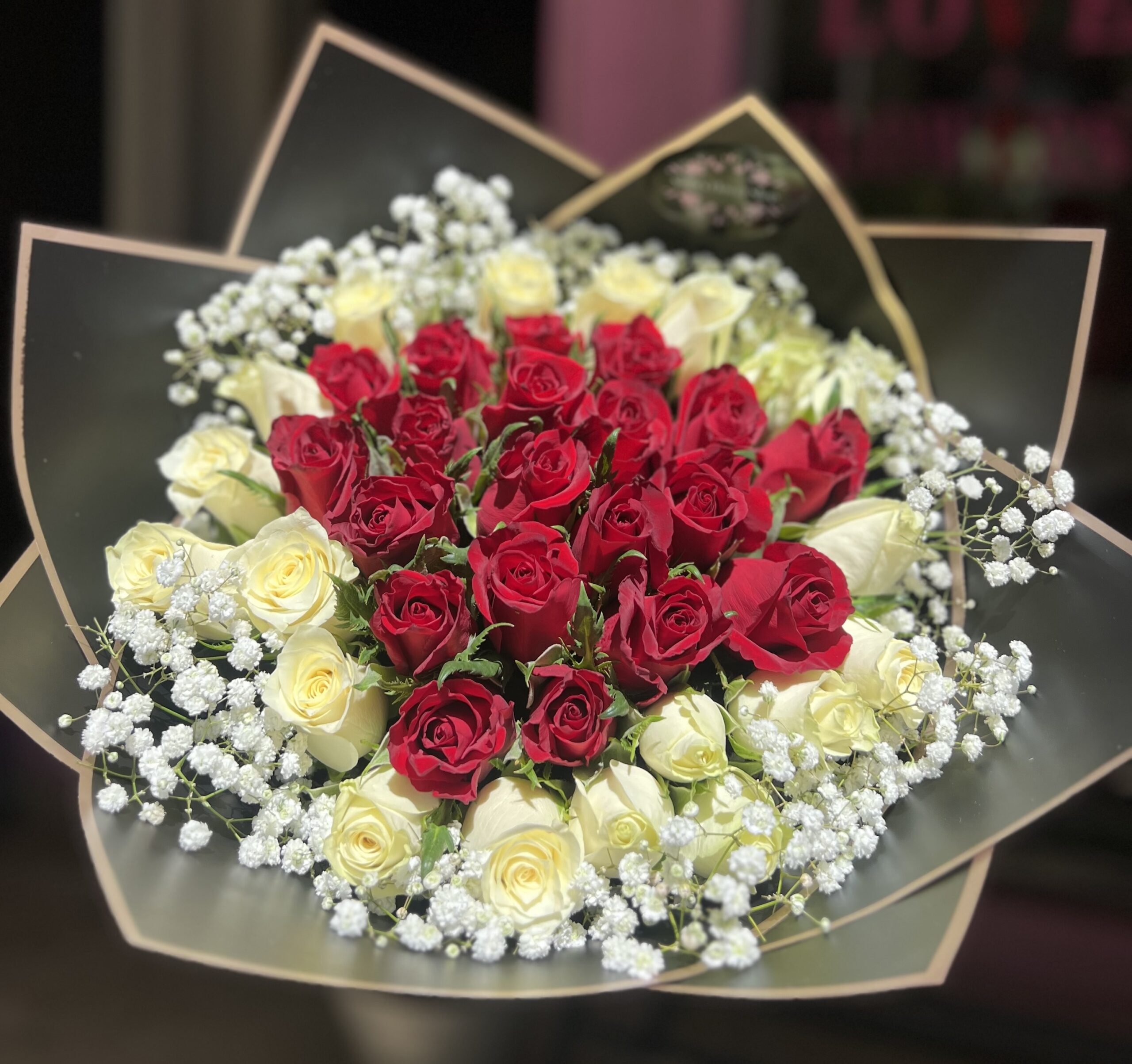 Make every moment unforgettable with our Special Wish Bouquet. Pure white roses at the center symbolize sincerity, surrounded by red roses for passion, and finished with a dreamy halo of baby’s breath.